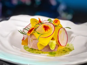 Silvio Germann, Küchenchef des Zwei-Sterne Restaurants Mammertsberg in Freidorf in der Schweiz, steht für eine elegante Balance aus hochwertigen, saisonalen Zutaten, klaren Aromen und viel Liebe zum Detail. 2024 wurde er vom Gault&Millau zum Koch des Jahres gekürt. Mit dem Anspruch, dass "man sieht, was man isst", gestaltet Silvio Germann seinen Gang für den Raum Ocean. Dort setzt er mit Hamachi, Gelber Bete und Kamille einen präzisen Akzent innerhalb der multisensorischen Reise.